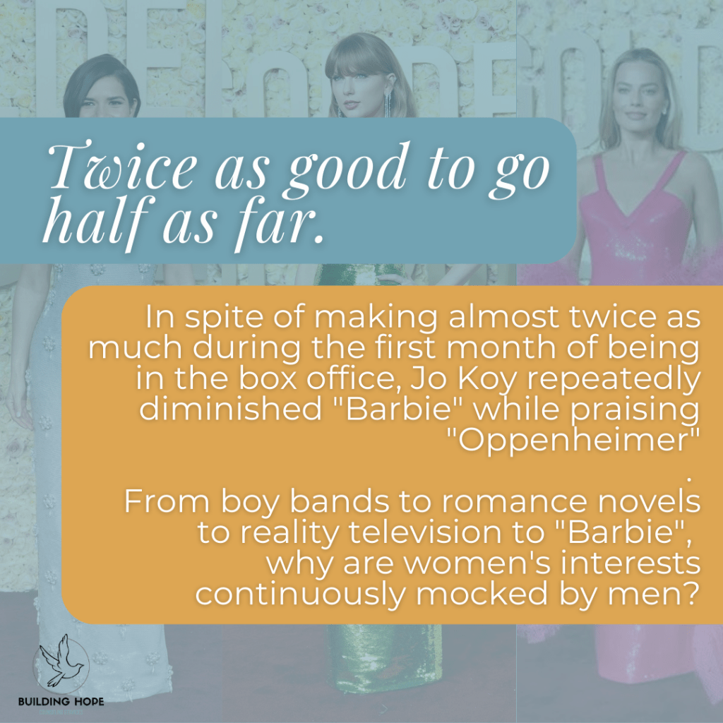 In the first month of being in theatres globally, “Barbie” earned 1.18 BILLION dollars, making Greta Gerwig the first solo female director to earn this honor. “Oppenheimer” brought in 648 million dollars in the same time frame, a little over half of the Barbie movie’s earnings. Yet, for some unknown reason, *cough cough it’s the patriarchy*, “Oppenheimer” is compared to “Barbie” as being more impressive, more important, over all just more. Just ask Jo Koy.