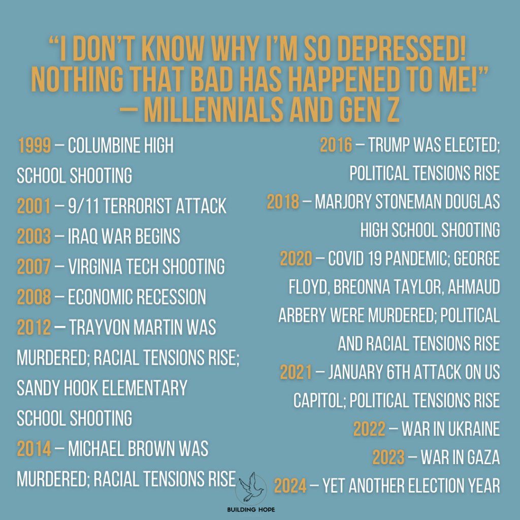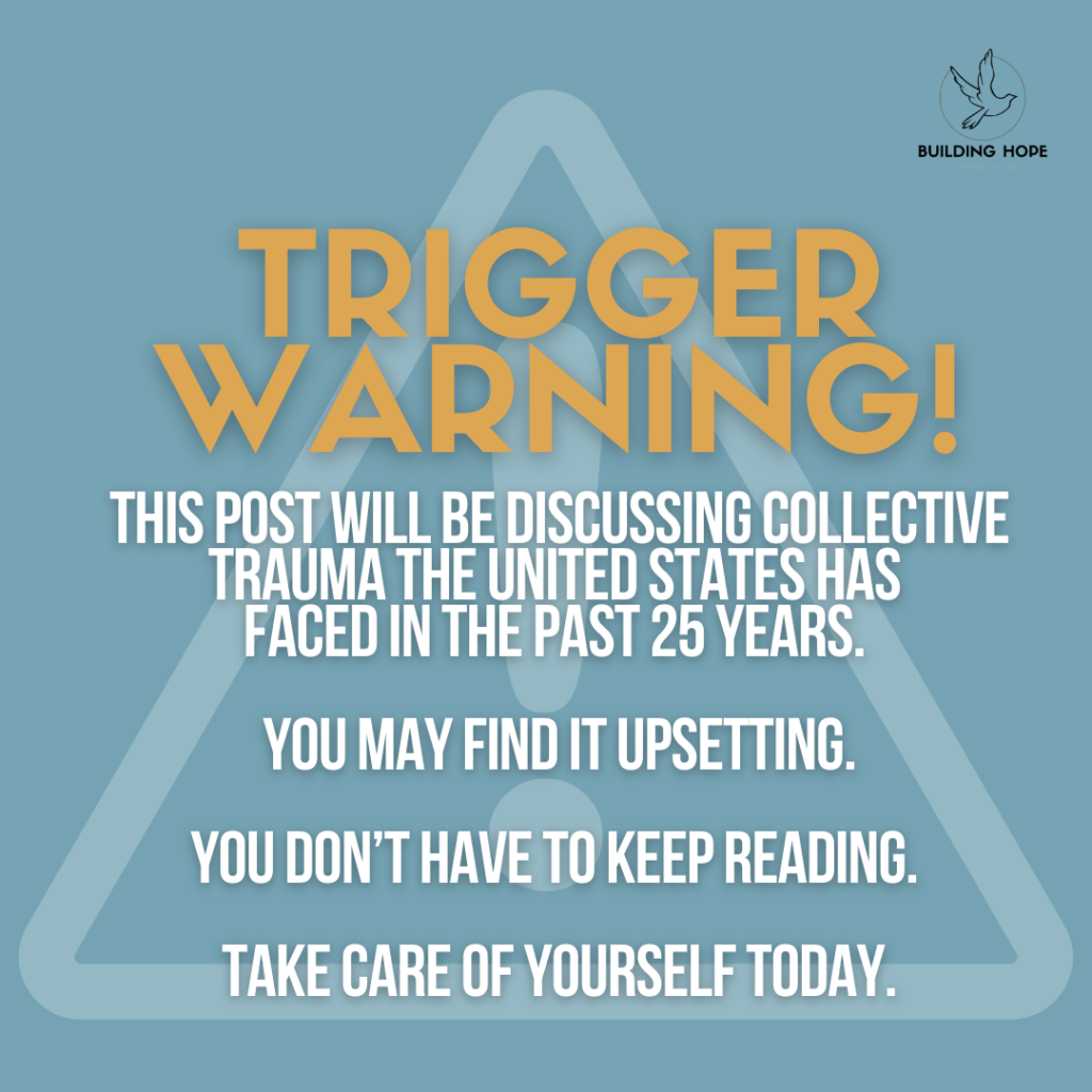 The United States, and the world at large, have faced several collective traumas in the past 25 years, impacting Gen Z and Millennial early development. We are going to specifically look at the impact of 9/11, school shootings, and social media on people born between the years of 1981 – 2012.